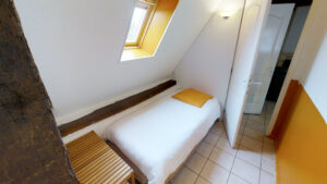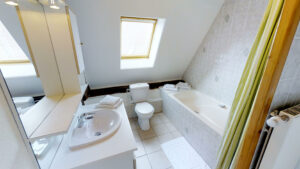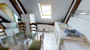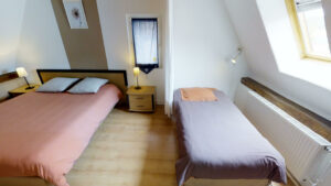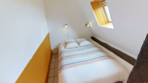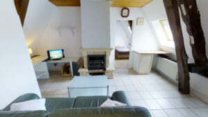 Le gîte l’étage de 70 m² comprend une grande pièce avec une cuisine ouverte, une table à manger et un coin salon avec une cheminée. Il dispose d’une chambre avec un grand lit de 160 cm et un lit de 90 cm. De plus, il y a une deuxième chambre avec un lit de 140 cm et un lit de 90 cm. Une salle de bain avec lavabo, baignoire et WC est également présente.